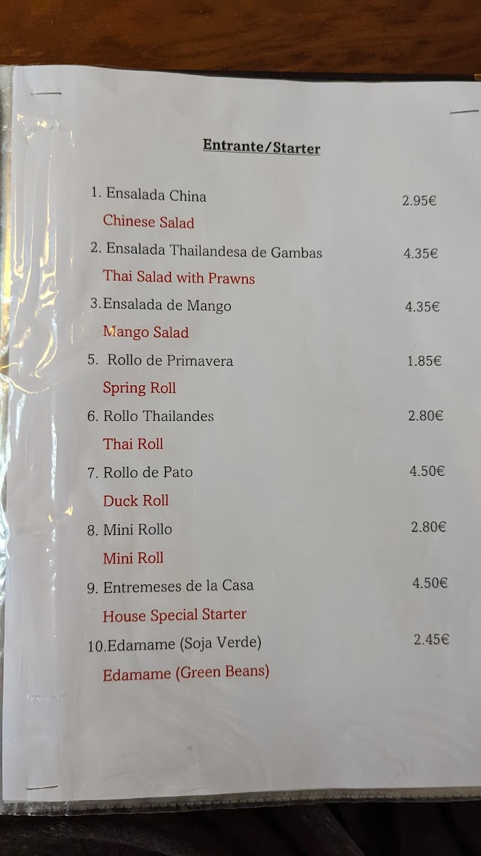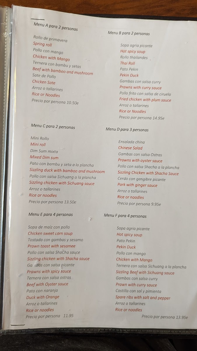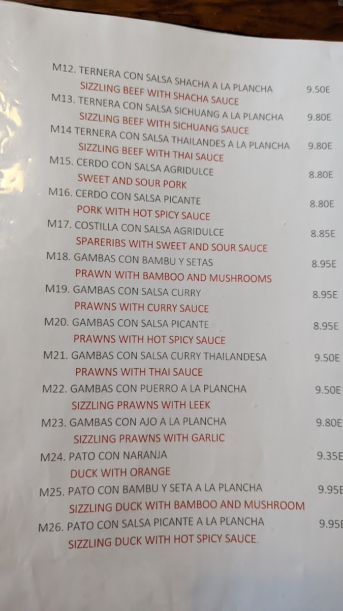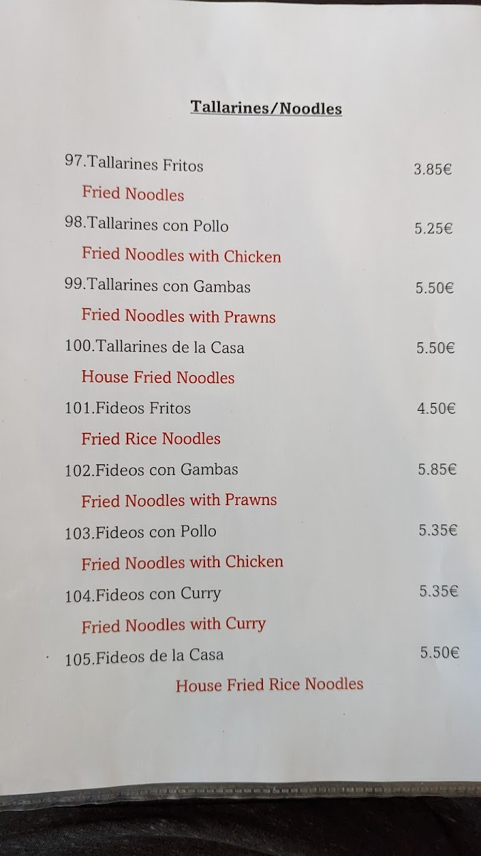The menu at Restaurante Hong Kong offers a delightful mix of classic Chinese dishes, each with a unique twist that showcases the restaurant's dedication to flavor and quality. The Sizzling Duck Noodles stand out with their savory richness, served on a hot plate to keep the dish steaming and aromatic. Another must-try is the Beef and Vegetable Fried Rice, a hearty, satisfying dish filled with tender beef and fresh vegetables, offering the perfect balance of flavors. The Tallarines are a crowd favorite, with perfectly cooked noodles paired with a selection of delicious vegetables and meats. For something more refreshing, the Te Chino provides a light yet flavorful taste, ideal for those looking for a lighter option. The Cóctel de Gambas offers a delightful starter, with juicy shrimp served in a tangy sauce, making for an excellent beginning to any meal. Lastly, the Pato Pekin is a showstopper, featuring crispy duck served with pancakes and a rich hoisin sauce, capturing the essence of traditional Peking duck. Overall, the menu at Restaurante Hong Kong blends familiar Chinese flavors with some exciting twists, making it a top choice for those in Xàbia seeking an authentic dining experience.